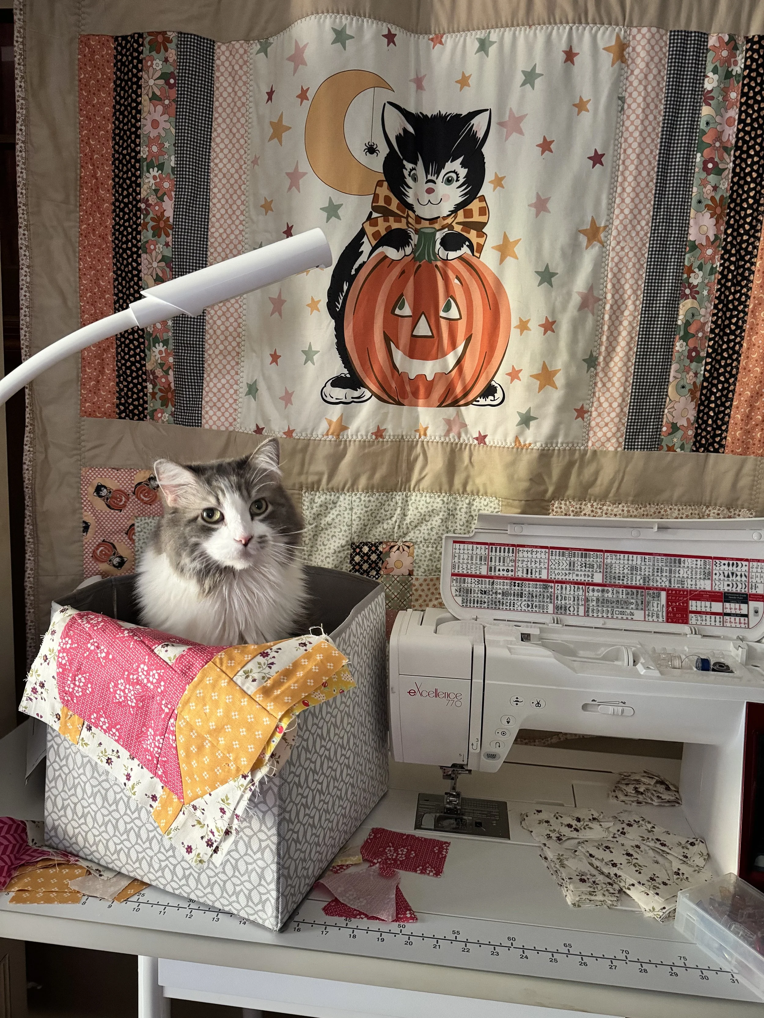 When I’m working on a quilting project, my 5 cats are right by my side, ready for a sniff test and fabric inspection and making sure everything is up to our high standards.